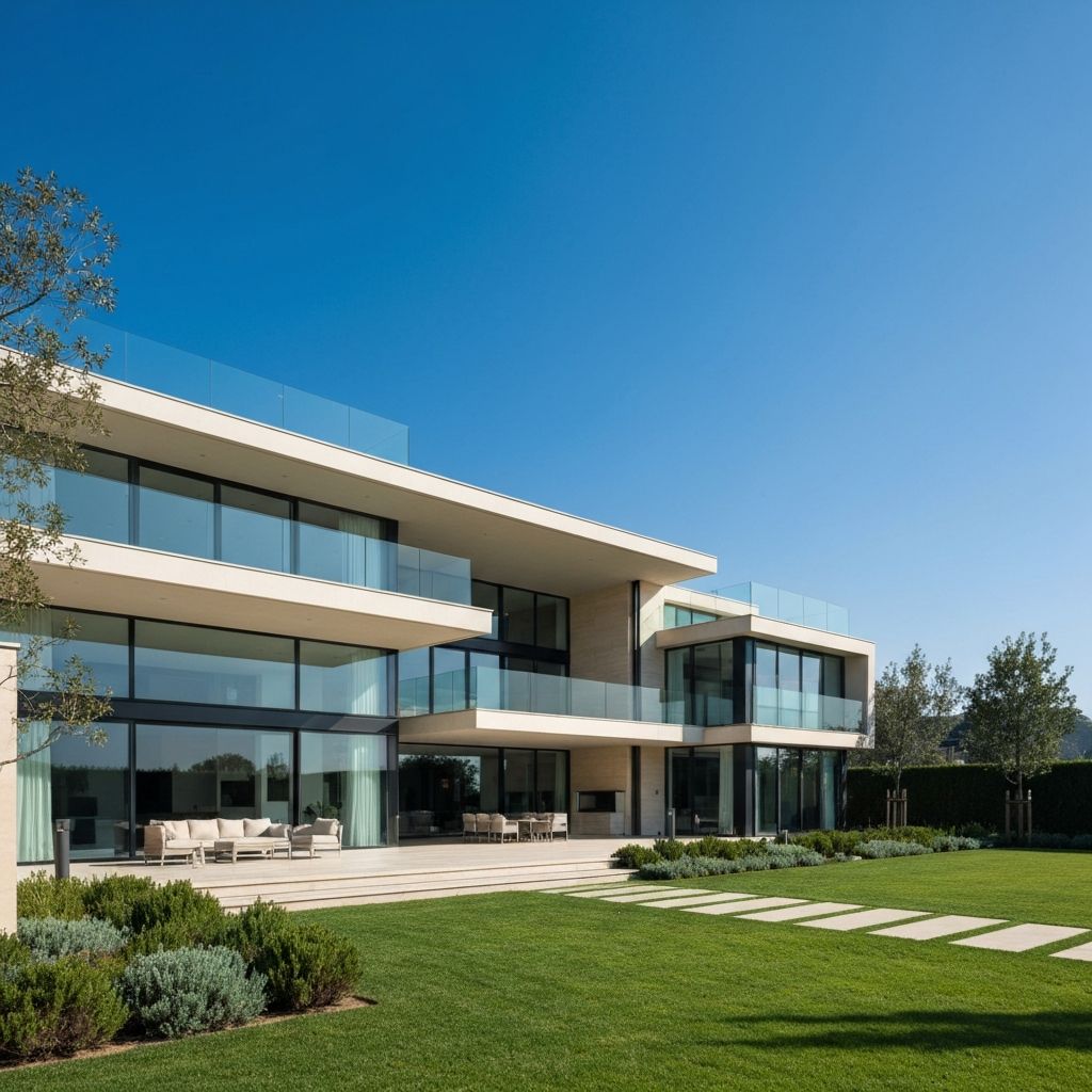 Showcasing a contemporary villa's seamless indoor-outdoor flow, lush landscaping, and exquisite architectural details.